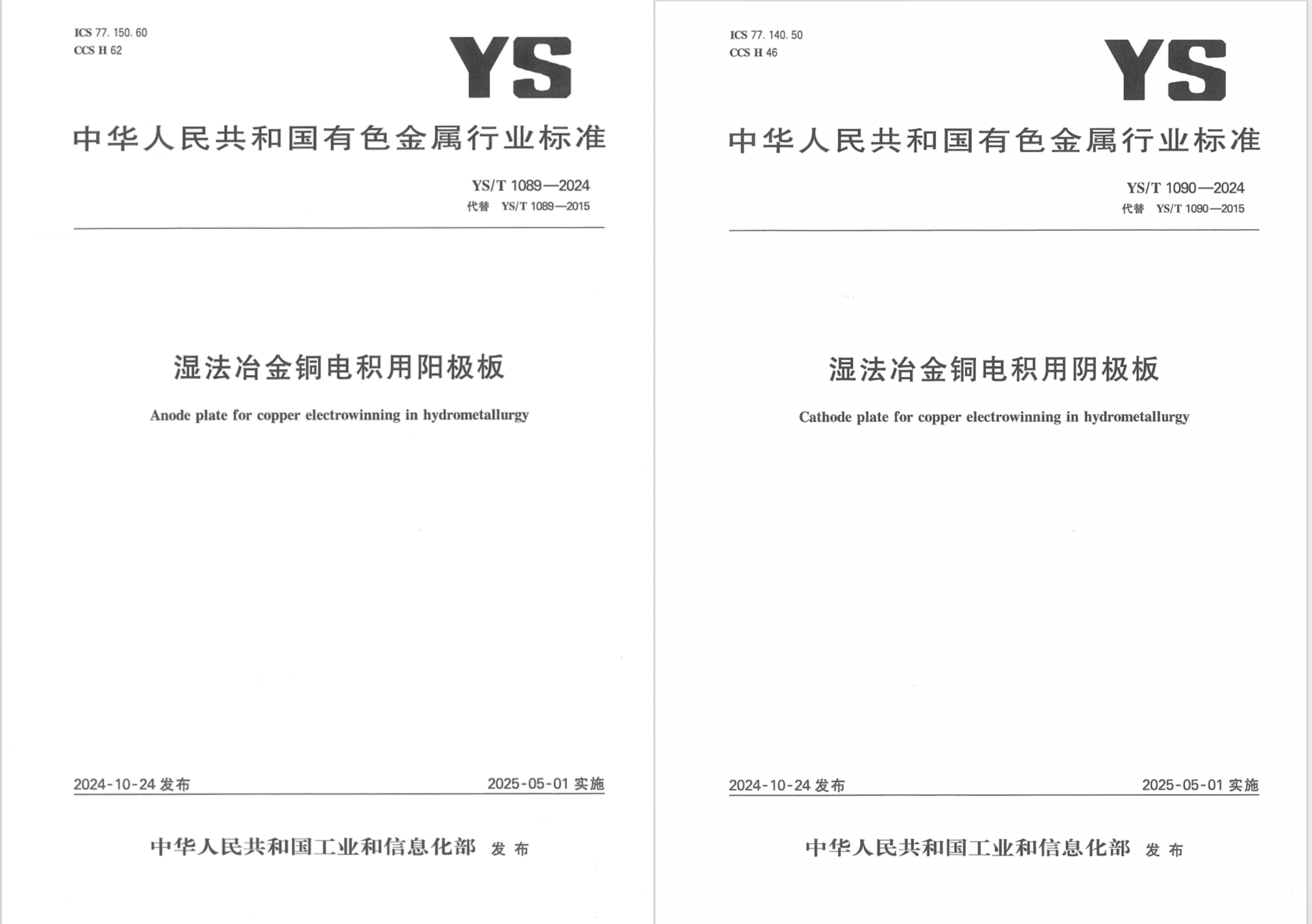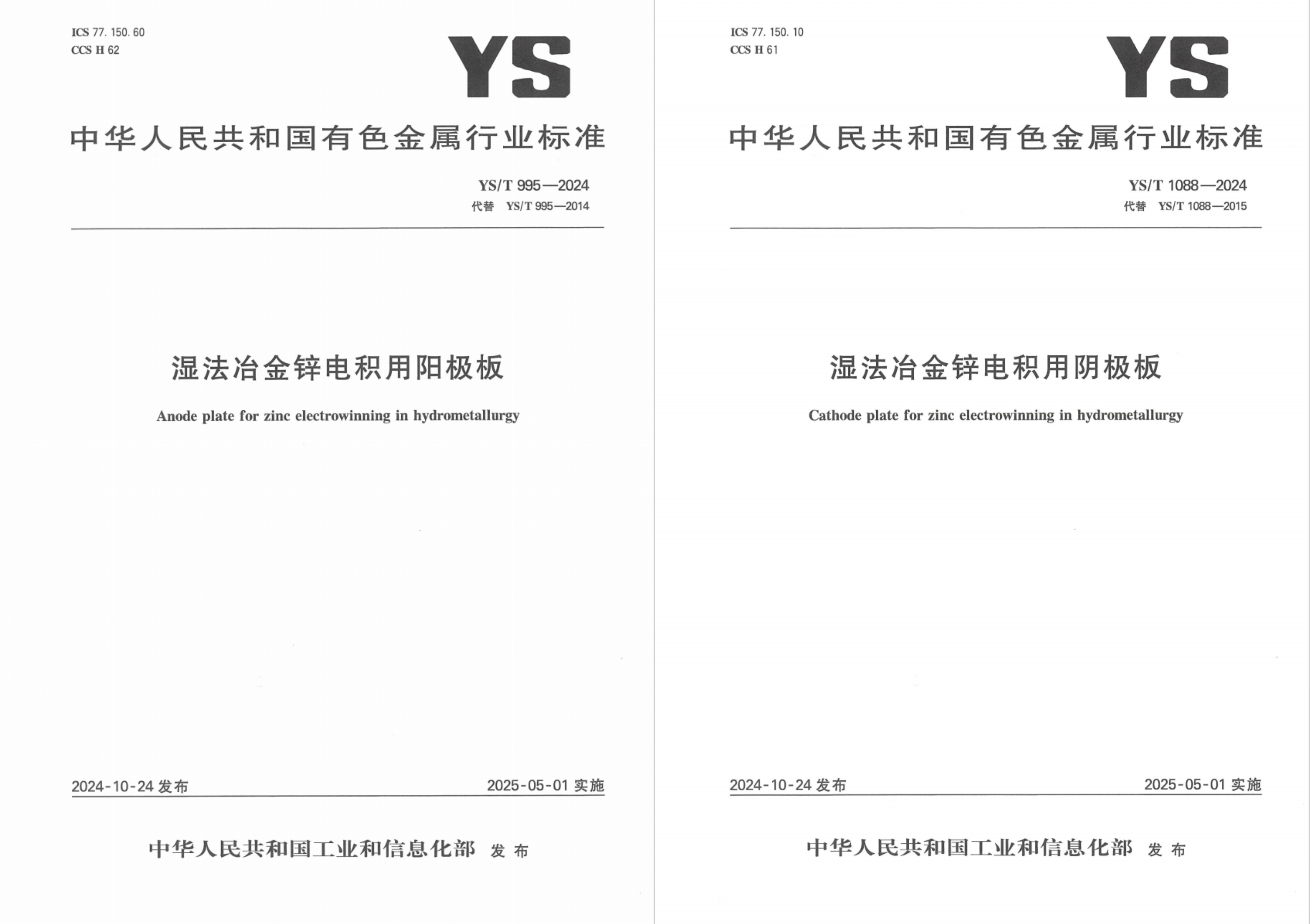 2024年10月24日,中華人民共和國工業(yè)和信息化部正式發(fā)布了由云南大澤電極科技股份有限公司(以下簡稱為“大澤”)作為發(fā)起單位和起草單位,聯(lián)合云南馳宏鋅鍺股份有限公司、北方礦業(yè)有限責任公司、河南豫光鋅業(yè)有限公司、深圳市中金嶺南有色金屬股份有限公司丹霞冶煉廠多家行業(yè)領軍企業(yè)共同修訂的濕法冶金電極板系列行業(yè)新標準。這一系列標準已于2025年5月1日正式實施!